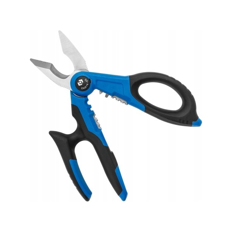 Proste nożyczki z solidną stalową ramą, która jest odporna na uszkodzenia mechaniczne i trwała. Nożyczki te służą do cięcia kabli i przewodów elektrycznych. Ząbkowane ostrze wykonane jest ze stali nierdzewnej 4034, co gwarantuje czyste cięcie. Dodatkowym atutem nożyczek jest specjalne zagłębienie, które ułatwia zdejmowanie izolacji i zapobiega wyślizgnięciu się kabla podczas cięcia. Rękojeść wykonana jest z lekkiego i wytrzymałego tworzywa PP + TPR, które jest odporne na uderzenia. Ergonomicznie zaprojektowane uchwyty zapewniają wygodne trzymanie i przyczyniają się do efektywności pracy. Nożyczki są wyposażone w plastikową osłonę na ostrze oraz klips umożliwiający przypięcie ich do pasa.