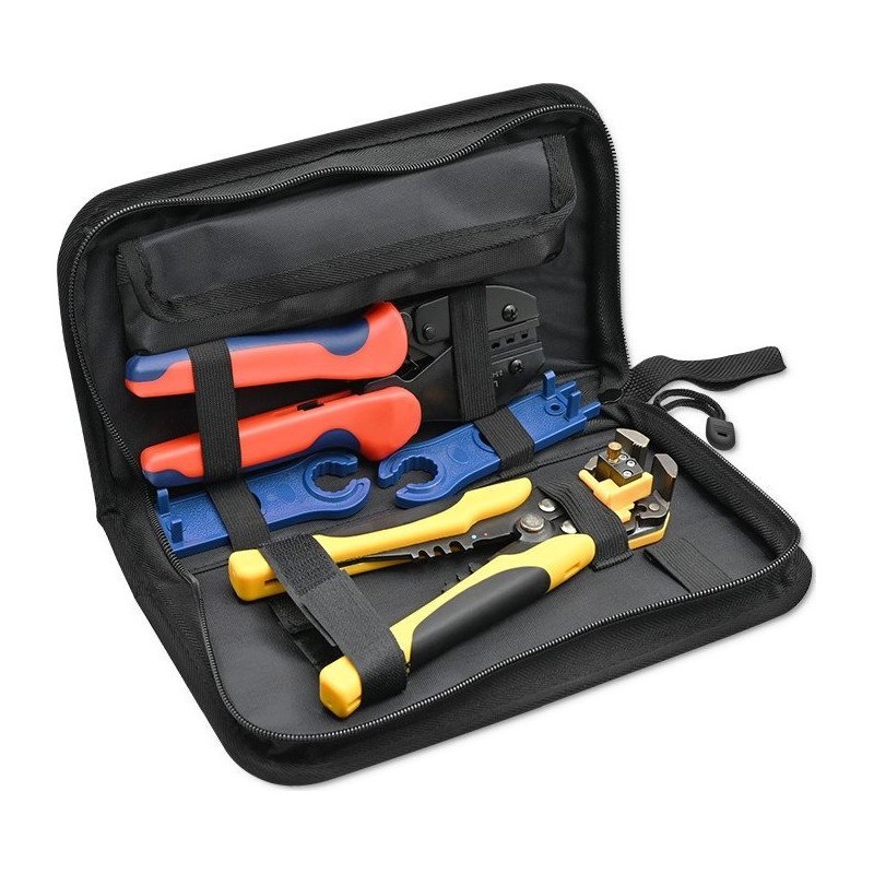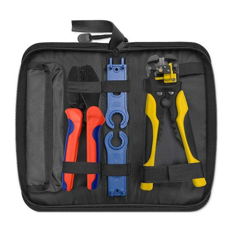 Praktyczne etui do przechowywania narzędzi solarnych z pewnością ułatwi przenoszenie narzędzi w czasie montażu instalacji solarnej oraz zabezpieczy przed przypadkową i utratą uszkodzeniami mechanicznymi. Wszystkie narzędzia kompatybilne ze złączami MC4, co pozwali Ci wykonać wszystkie prace związane z montażem konektorów solarnych oraz podłączaniem przewodów do instalacji fotowoltaicznej. Już teraz możesz z łatwością ściągać izolację z przewodów lub przecinać kable i przewody o różnej średnicy.