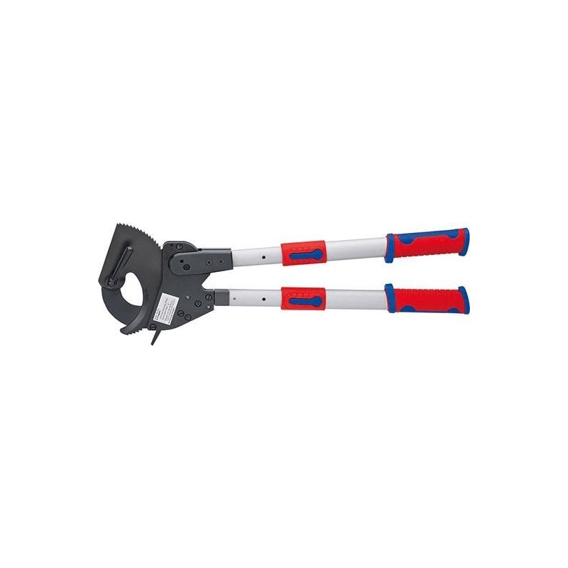 Nożyce do cięcia kabli z grzechotką z ramionami teleskopowymiWykonanie: szczypce precyzyjne ze specjalnej stali narzędziowej specjalnego gatunku, hartowanej w oleju i odpuszczanej. Ramiona z owalnej rury z aluminium o wysokiej wytrzymałości. Główka oksydowana. Bardzo wysoka wydajność przecinania dzięki dwuręcznej obsłudze i mechanizmowi zapadkowemu, niewielki nakład siły dzięki optymalnemu przełożeniu dźwigni. Ramiona z wielostopniową regulacją , pozwalają się także indywidualnie dopasować do warunków pracy. Narzędzie można otworzyć w każdej pozycji cięcia. Rękojeści z wielokomponentowymi nakładkami z tworzywa sztucznego. Zastosowanie: do równego przecinania jedno- i wielożyłowych kabli miedzianych i aluminiowych bez zgniatania a także kabli z twardej gumy i materiałów z tworzyw sztucznych. Nadają się również do kabli z metalowym oplotem. Wskazówka: nie stosować do drutu stalowego i do drucianych lin....