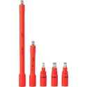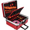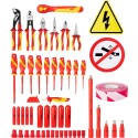 Zestaw narzędzi izolowanych do naprawy aut elektrycznych i hybrydowych 51 elementów, wymiar 500x415x260mm, waga 10,64 kg, wyposażenie:6 szt. szczypiec izolowanych: szczypce uniwersalne 200 mm, szczypce wygięte 200 mm, szczypce boczne 180 mm, szczypce płaskie 160 mm, szczypce do rur 250 mm, obcinak do kabli 250 mm, 1 szt. izolowany nóż, 7 sztuk wkrętaków izolowanych: SL2.5x75mm, SL3.0X100mm, SL3.5x100mm, SL4x100mm, PH1x80mm, PH2x100mm, PH3x150mm, 3 szt. izolowanych wkrętaków Torx: T20x100mm, T25x125mm, T30x130mm, 10 szt. izolowane samozaciskowe nasadki kablowe; 10mm, 20mm po 5szt, 2 szt. znaków ostrzegawczych z PVC, 1 szt. taśma ostrzegawcza (nieprzylepna): 500 m długości x 50 mm szerokości, czerwono biała, 15 szt. nasadek 3/8" izolowanych rozmiary: 6mm/7mm/8mm/9mm/10mm/11mm/12mm/13mm/14mm/16mm/17mm/18mm/19mm/20mm/22mm, 3 szt. nasadek 3/8" izolowanych gwiazdkowych 100mm: M8/M10/M12, 1 szt. 3/8 ''izolowany klucz grzechotkowy 200mm, 2szt 3/8 ''izolowanych przedłużek: 125mm, 250mm