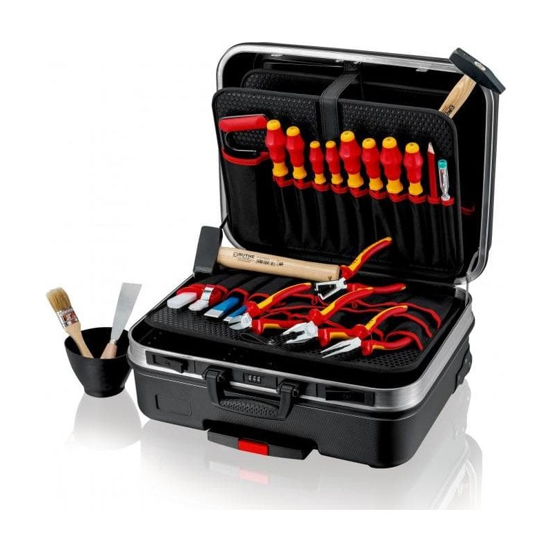 - Wyposażony w sześć narzędzi KNIPEX, łącznie 24 markowe narzędzia, częściowo przetestowane przez VDE zgodnie z DIN EN 60900