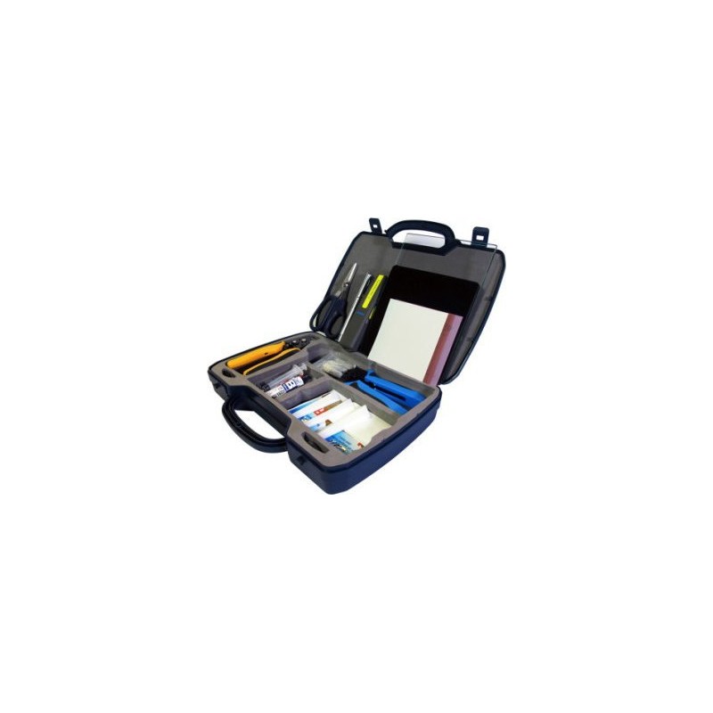 Podstawowy zestaw narzędzi do włókna szklanego, w tym rejestrator z węglików spiekanych, strzykawki, stripper, klej epoksydowy i utwardzacz, roztwór czyszczący, tarcze polerskie, papier ścierny, obcinak do kevlaru, szklana płyta robocza, szczypce do zaciskania, folia polerska, gumowa płyta robocza, mieszalnik epoksydowy, akcesoria do mieszalnika epoksydowego i Fiber Checker Pro. - Rejestrator z węglików spiekanych x 1 szt - Strzykawki x 2 szt - Stripper HT-223H x 1 szt każdy - Superklej epoksydowy A/B i utwardzacz - Klej epoksydowy A/B i utwardzacz x 1 szt. każdy - Roztwór czyszczący x 1 szt - Tarcza polerska ST x 1 szt - Tarcza polerska SC x 1 szt - Papier ścierny x 3 szt - Przecinak do kevlaru x 1 szt - Szklany blat roboczy x 1 szt - Szczypce zaciskowe HT-225H x 1 szt - Brązowa diamentowa folia polerska (6μm) x 1 szt - Fioletowa diamentowa folia polerska (1μm) x 1 szt - Biała folia polerska z tlenku glinu (0.5μm) x 1 szt - Gumowy blat roboczy x 1 szt - Mieszalnik epoksydowy x 3 szt - Akcesoria do mieszalnika epoksydowego x 3 szt - FC-2005 Fiber Checker Pro x 1 szt