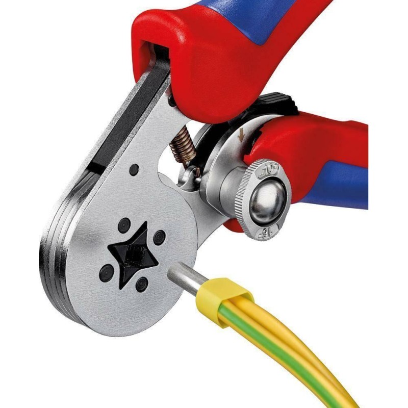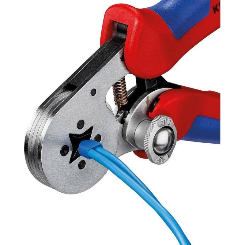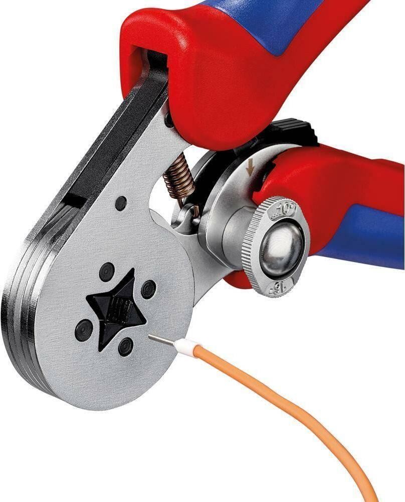 Szczypce do zagniatania tulejek kablowych Wykonanie: ze stali elektrycznej chromowo-wanadowej, kute, hartowane olejowo i odpuszczane. Aby uzyskać optymalne wyniki zagniatania dzięki precyzyjnym profilom i blokadzie wymuszonej z możliwością zwolnienia, siła zacisku ustawiana jest fabrycznie. Wzmocnienie siły dzięki przełożeniu dźwigni, rękojeści powlekane wielokomponentowym tworzywem sztucznym. Z ładowaniem z boku. Z jednym gniazdem zaciskowym.Zastosowanie: do zagniatania tulejek kablowych DIN 46228 (część 1 + 4), z kołnierzem z tworzywa sztucznego. Główka chromowana. Zacisk czworokątny.