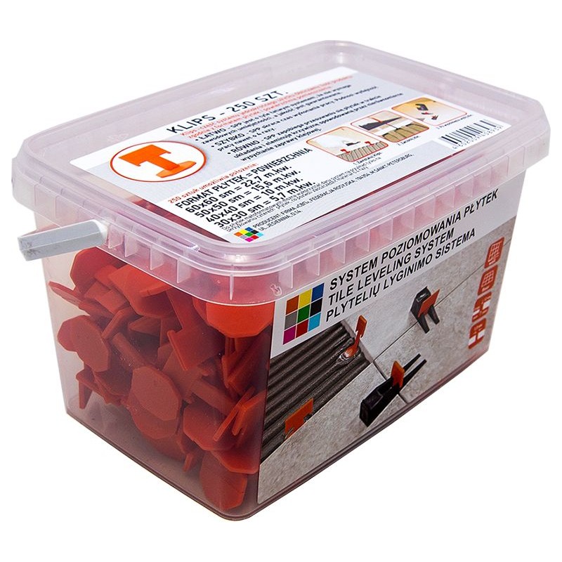 KLIPS -– część systemu jednokrotnego użytku. Obliczamy ilość produktu zgodnie z formatem płytek i powierzchnia pomieszczenia. 500 sztuk umożliwia położenie: 60х60 sm = 90 m.kw. 50х50 sm = 62 m.kw. 40х40 sm = 40 m.kw. 30х30 sm = 23 m.kw. Dla dokładnego obliczenia zaleca się stosowanie KALKULATORA