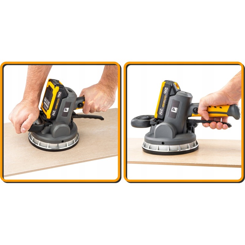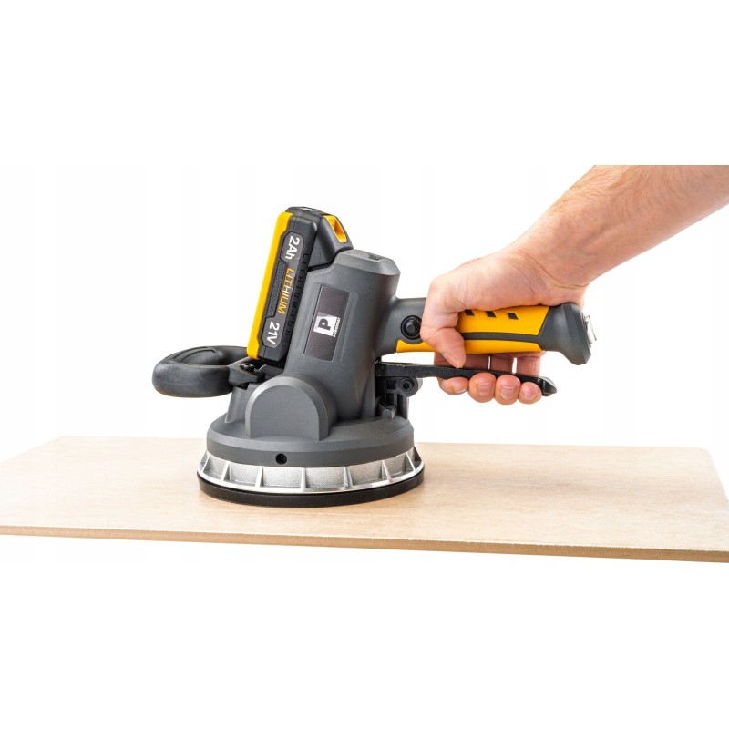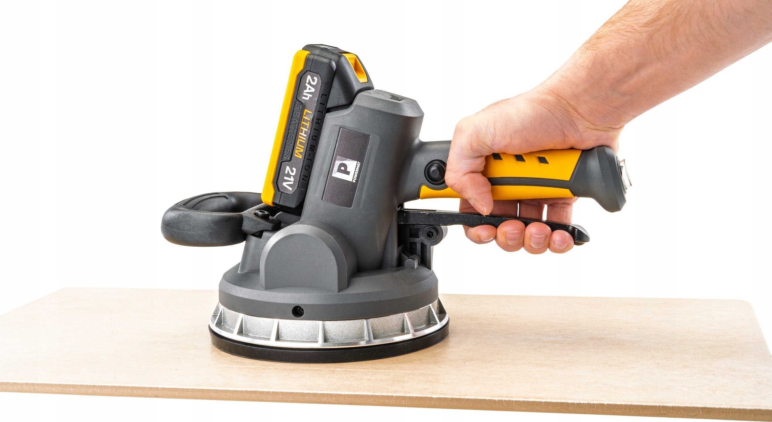 Przyssawka zasilana baterią litową 21V ułatwia układanie dużych płyt i płytek, zastępując tradycyjną obsługę ręczną. Dzięki ergonomicznemu uchwytowi i regulowanej intensywności wibracji zapewnia stabilność i precyzję.