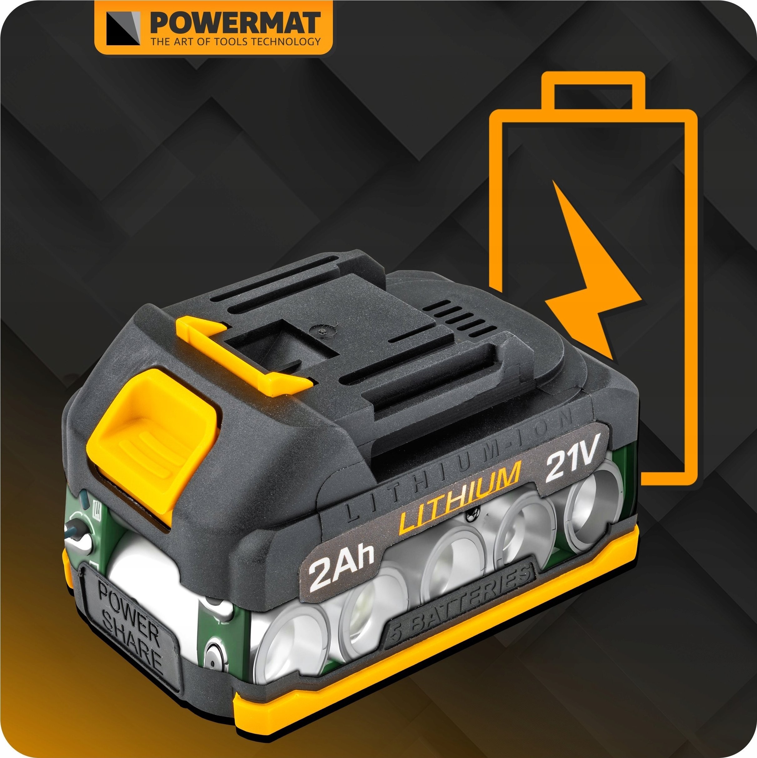 Bateria litowo-jonowa o pojemności 2000 mAh pozwala na długie użytkowanie urządzenia bez potrzeby częstego ładowania. W zestawie znajdują się dwa akumulatory 21V/2Ah, które umożliwiają nieprzerwaną pracę – jeden ładuje się, gdy drugi jest używany.