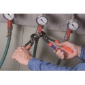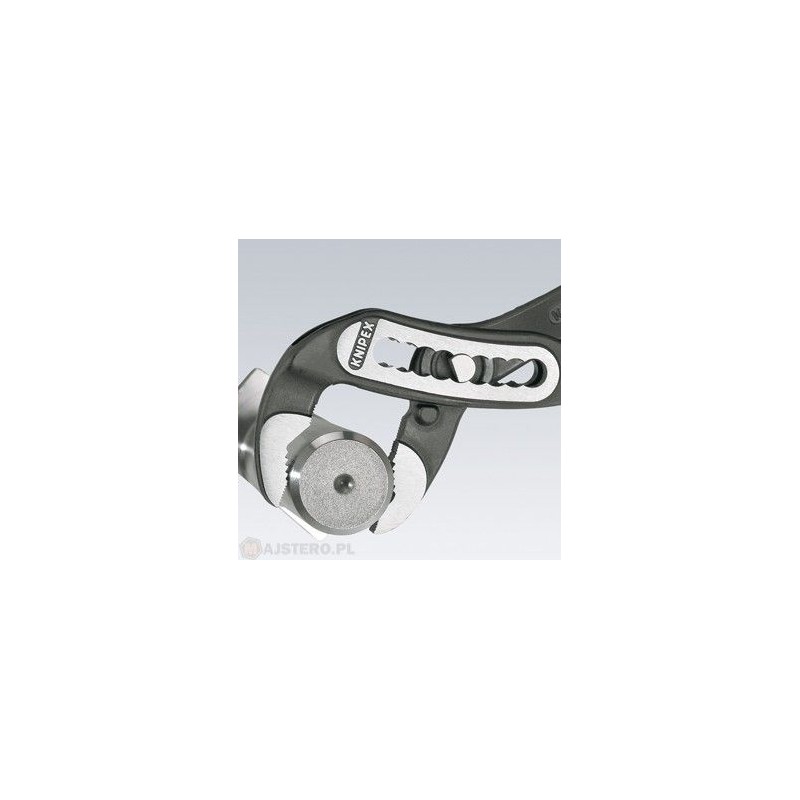 Szczypce Knipex samo zaciskające się na rurach i nakrętkach, nie zsuwają się z chwytanego przedmiotu i wymagają użycia niewielkiej siły. Duże przełożenie przekłada się lekką pracę tym narzędziem. Solidna i prosta konstrukcja odporna na zabrudzenia, szczególnie przydatne do prac na zewnątrz. Kształt rękojeści zabezpiecza przed przyciśnięciem palców.