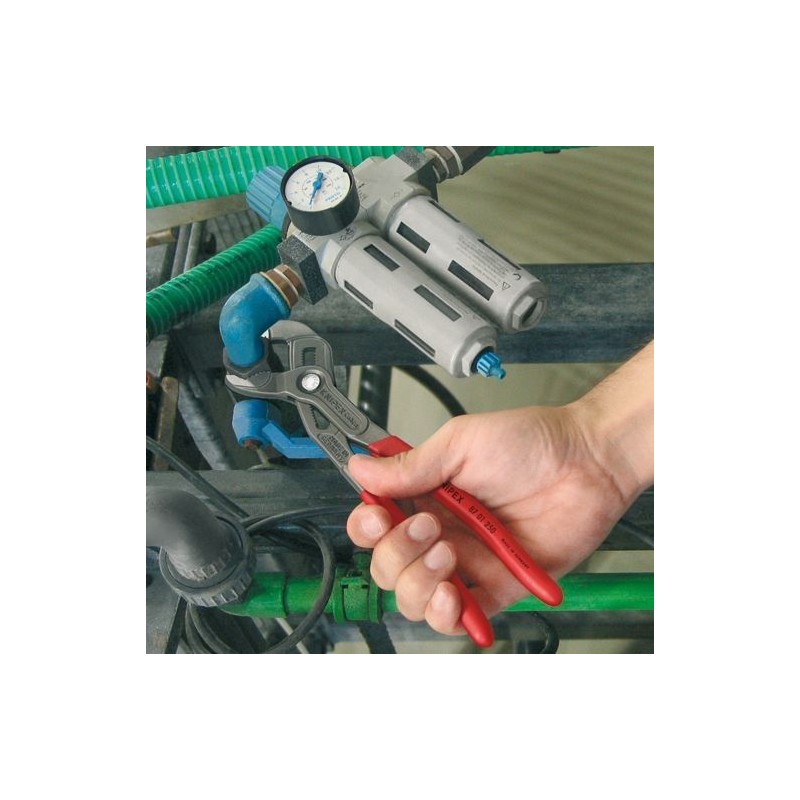 KNIPEX Cobra® - szczypce do rur nowej generacji. Nigdy więcej czasochłonnego dopasowywania rozwarcia szczęk do odpowiedniego rozmiaru. Wystarczy tylko umieścić górną szczękę na chwytanym przedmiocie, nacisnąć przycisk i przyciągnąć dolną szczękę. To takie proste!