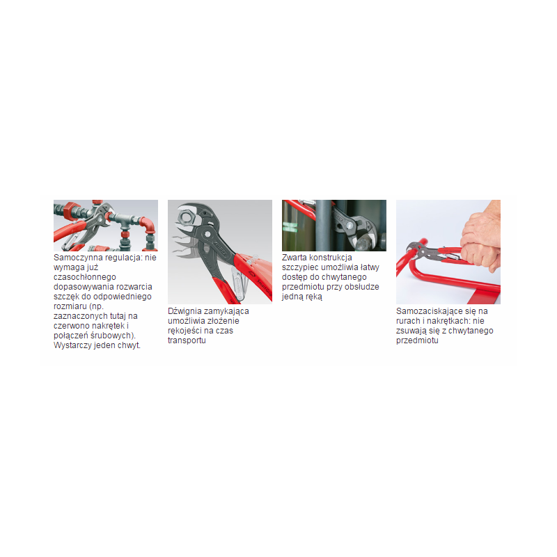 - W przypadku szczypiec do rur SmartGrip® firmy KNIPEX dopasowanie do wielkości chwytanego przedmiotu odbywa się całkowicie automatycznie! Wystarczy przyłożyć szczypce, ścisnąć rękojeści i gotowe