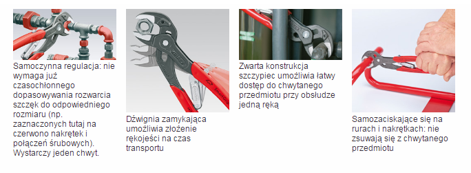 - Samozaciskające się na rurach i nakrętkach: nie zsuwają się z chwytanego przedmiotu; wymagają użycia niewielkiej siły