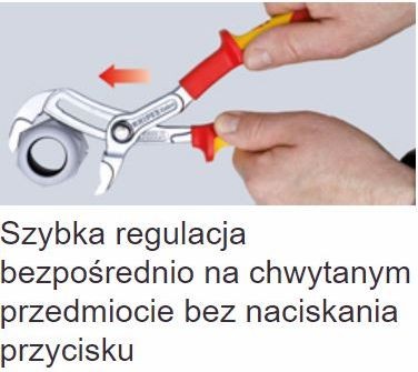 Dopasowanie zakresu chwytu szczypiec KNIPEX Cobra® VDE do przedmiotu odbywa się w sposób prosty i pewny: po otwarciu szczypiec wystarczy umieścić górną szczękę na chwytanym przedmiocie, zsunąć szczypce.