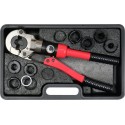 - Zawartość zestawu: praska, matryca zapasowa typ U x4 (16 mm, 20 mm, 25 mm, 32 mm), matryca zapasowa typ TH x4 (16 mm, 20 mm, 26 mm, 32 mm)