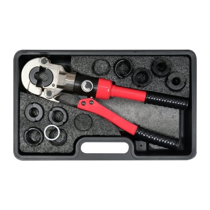 Ręczna praska hydrauliczna do zaciskania złączek na rurach PEX-AL-PEX, PERT-AL-PERT z zestawem 8 matryc. Wyposażona jest w siłownik hydrauliczny pozwalający precyzyjnie i szczelnie zacisnąć złączki z siłą nacisku 10T. System szybkiej wymiany matryc umożliwia łatwą wymianę matryc.