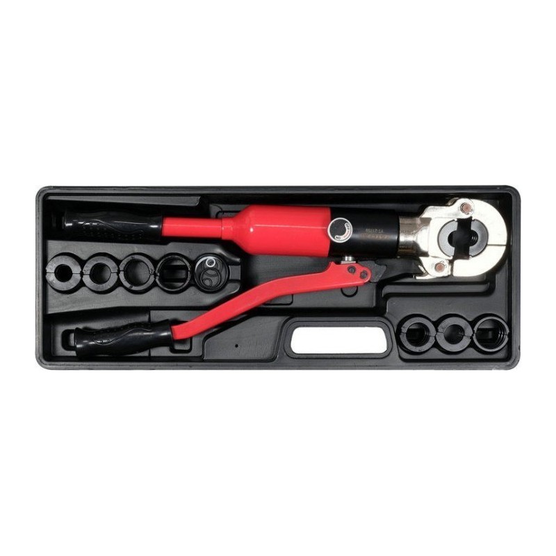 Ręczna praska hydrauliczna do zaciskania złączek na rurach PEX-AL-PEX, PERT-AL-PERT z zestawem 8 matryc. Wyposażona jest w siłownik hydrauliczny pozwalający precyzyjnie i szczelnie zacisnąć złączki z siłą nacisku 10T. Głowica obrotowa 360° umożliwia pracę w trudno dostępnych miejscach. System szybkiej wymiany matryc umożliwia łatwą wymianię matryc.
