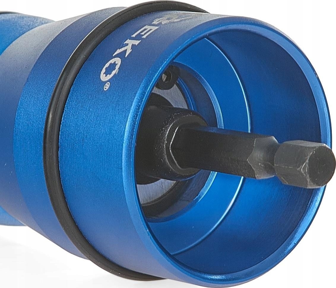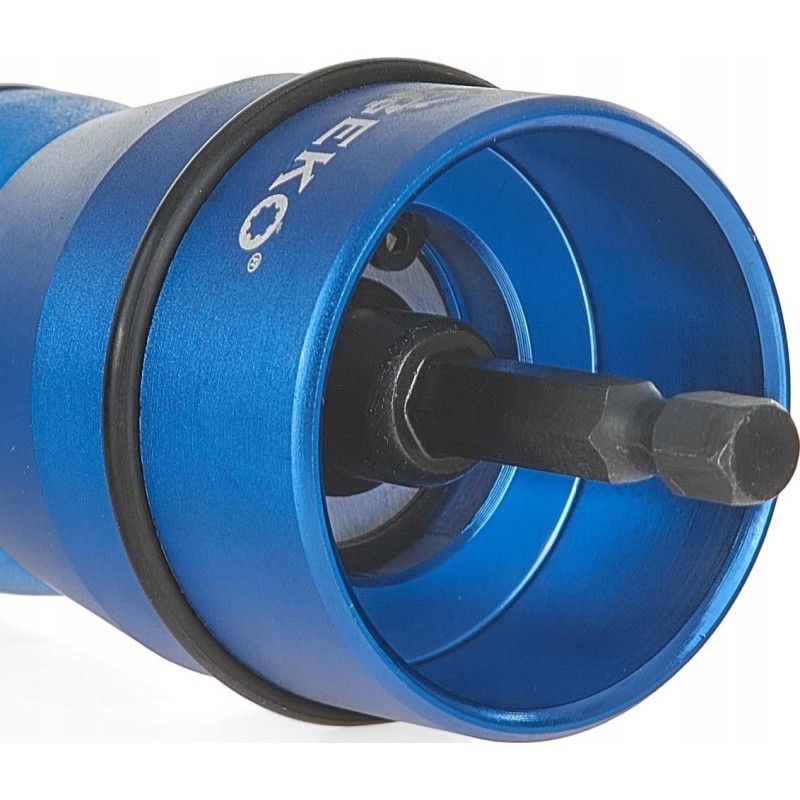Przejściówka do nitonakrętek: Solidny i precyzyjny korpus wykonany z aluminium i TPR (termoplastycznego kauczuku) zapewnia wytrzymałość i wygodne trzymanie.