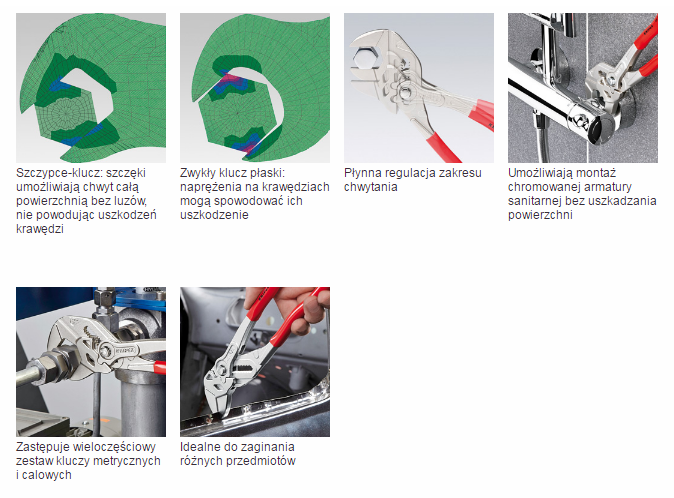 - Jeśli to konieczne, gładkie szczęki chwytają z dużą siłą wszystkie równoległe powierzchnie w zakresie swojego chwytu, zapewniając szczypcom niemal nieograniczone możliwości zastosowania: np. do kontrowania śrub, dociskania elementów łączonych przy użyciu klejów kontaktowych, odłamywania krawędzi przy pracach glazurniczych, rozłączania opasek zaciskowych jak również mogą być wykorzystanie jako małe imadło