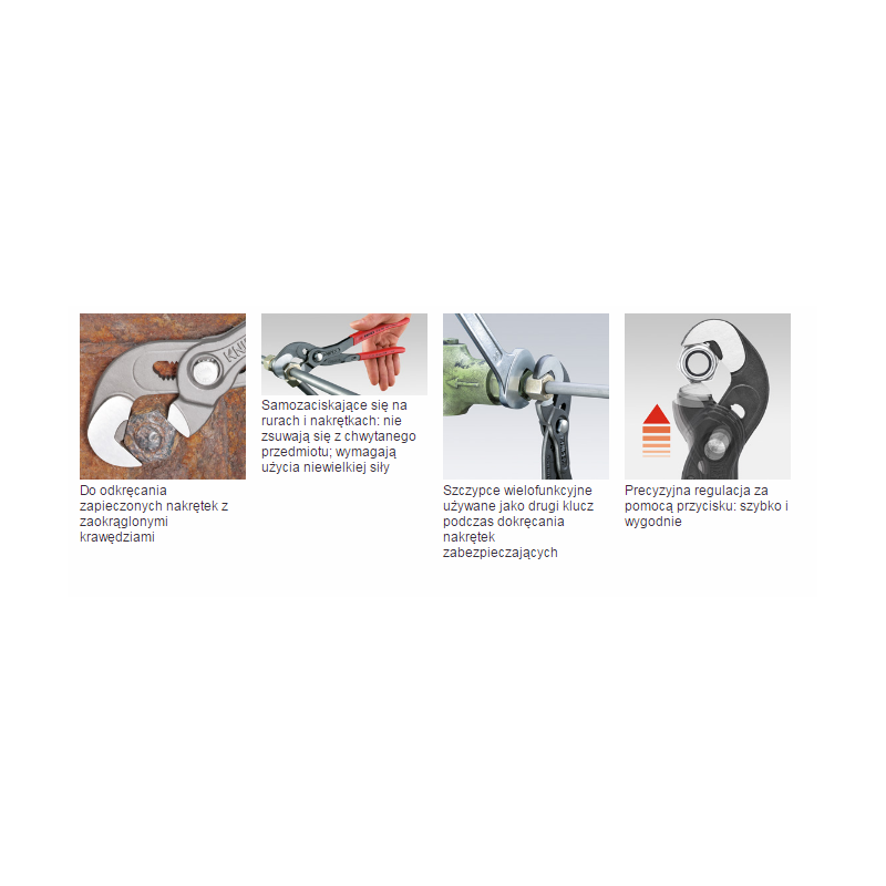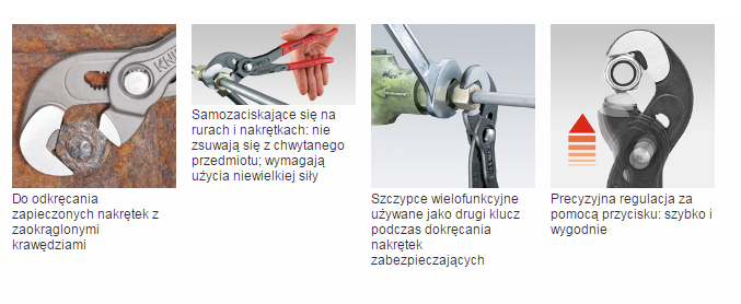 Szczypce wielofunkcyjne KNIPEX to narzędzie łączące komfort nastawiania rozstawu bezpośrednio na chwytanym przedmiocie przez naciśnięcie przycisku z funkcją uniwersalnego narzędzia. Brak luzów pomiędzy szczękami a chwytanym elementem zapobiega ześlizgiwaniu się narzędzia, eliminując ryzyko uszkodzenia (zaokrąglenia) chwytanej nakrętki lub śruby. Nawet zardzewiałe czy pokryte farbą nakrętki i śruby, których odkręcanie za pomocą zwykłego klucza jest wyjątkowo trudne, mogą z łatwością zostać zdemontowane dzięki wyjątkowo silnie chwytającym szczękom.