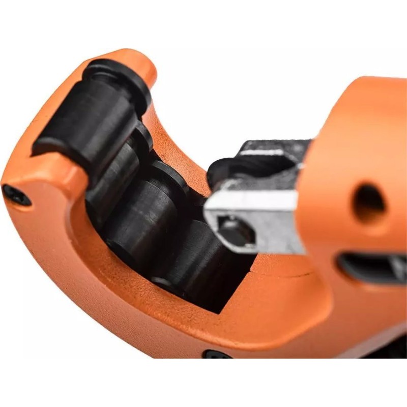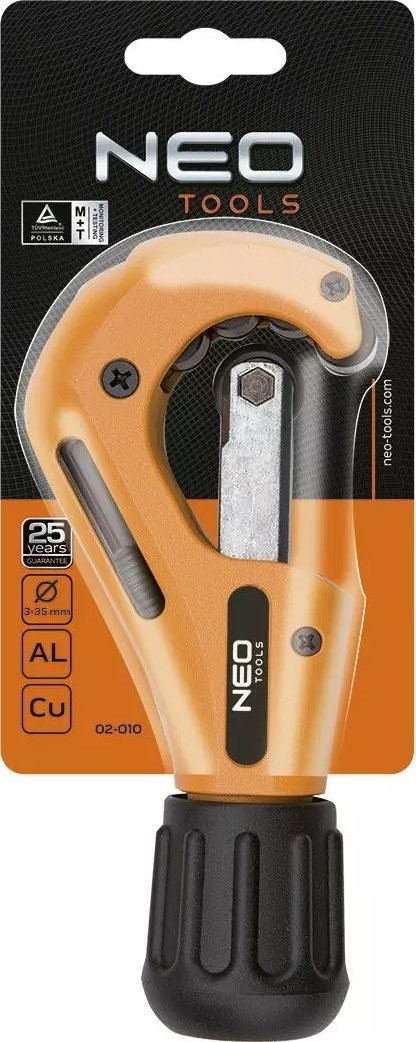 Obcinak do rur miedzianych i aluminiowych NEO (nr ref. 02-010) o zakresie cięcia 3-35 mm. 4 rolki prowadzące, z gratownikiem i zapasowym kółkiem tnącym znajdującym się w pokrętle obcinaka. Kółko tnące wykonane z wysokiej jakości stali stopowej, o twardości 56-58 HRC. Jakość narzędzia potwierdzona certyfikatem TÜV i 25-letnią gwarancją producenta. Marka NEO spełnia oczekiwania profesjonalistów.