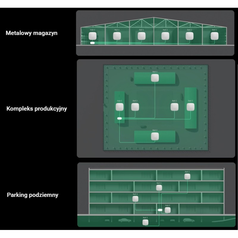 Podwajacze zasięgu rozszerzają granice chronionego obszaru i umożliwiają swobodne rozmieszczenie urządzeń systemu alarmowego. Podłączając cały lub część urządzeń1 do ReX 2, możemy zapewnić bezpieczeństwo i automatyzację centrum biznesowego, dużej nieruchomości, kompleksu magazynowego lub dużego zakładu produkcyjnego.