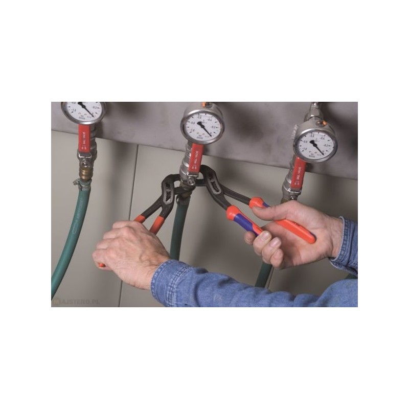 Szczypce Knipex samo zaciskające się na rurach i nakrętkach, nie zsuwają się z chwytanego przedmiotu i wymagają użycia niewielkiej siły. Duże przełożenie przekłada się lekką pracę tym narzędziem. Solidna i prosta konstrukcja odporna na zabrudzenia, szczególnie przydatne do prac na zewnątrz. Kształt rękojeści zabezpiecza przed przyciśnięciem palców.