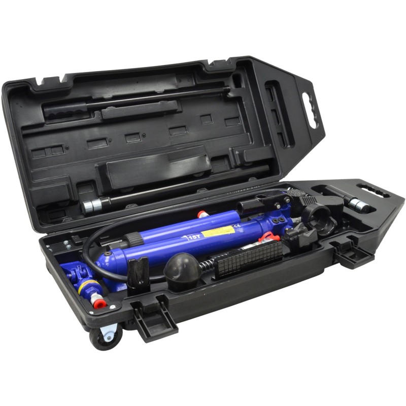 Zestaw profesjonalnych rozpieraków 15 ton w walizce. Zestaw został wyposażony w wydajną pompę hydrauliczną dzięki której wykonasz następujące prace: podnoszenie, ściąganie, zginanie, prostowanie oraz rozpieranie.