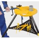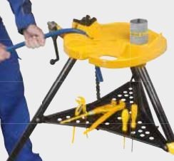 - Płyta robocza ze zintegrowanym imadłem łańcucho wym z podwójnymi szczękami mocującymi, podporą rury, uchwytami narzędziowymi, 3 giętarkami do gięcia rur Ø 10 – 26 mm, Ø ⅜ – ¾", głowica mocująca.