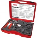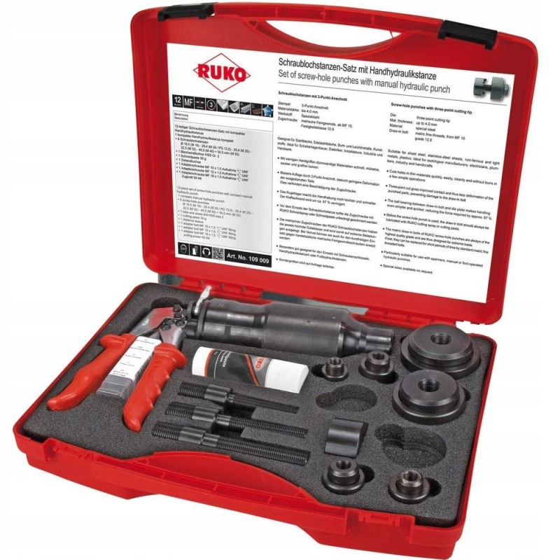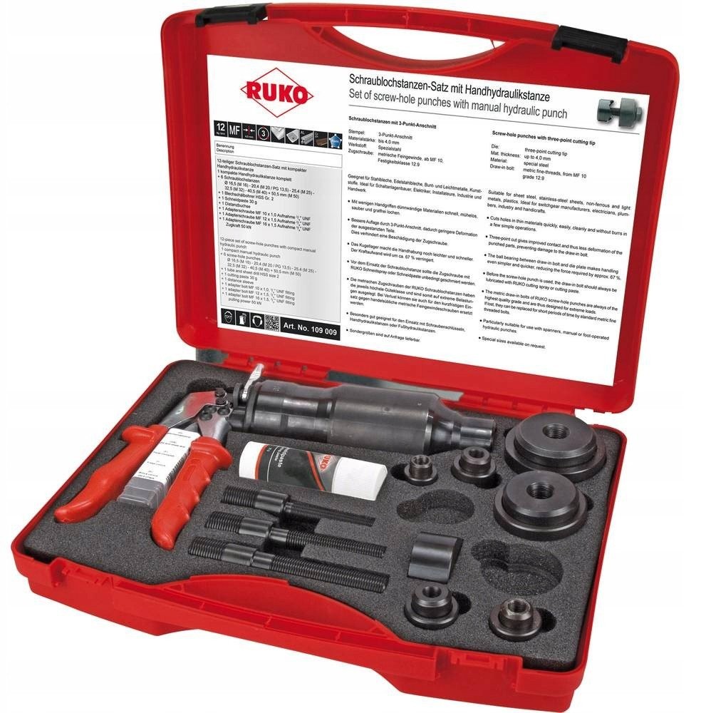 Zestaw RUKO składa się z 12 elementów, w tym poręcznego narzędzia hydraulicznego oraz sześciu wybijaków o różnych średnicach, co czyni go idealnym wyborem dla każdego, kto ceni sobie efektywność i prostotę obsługi.