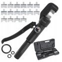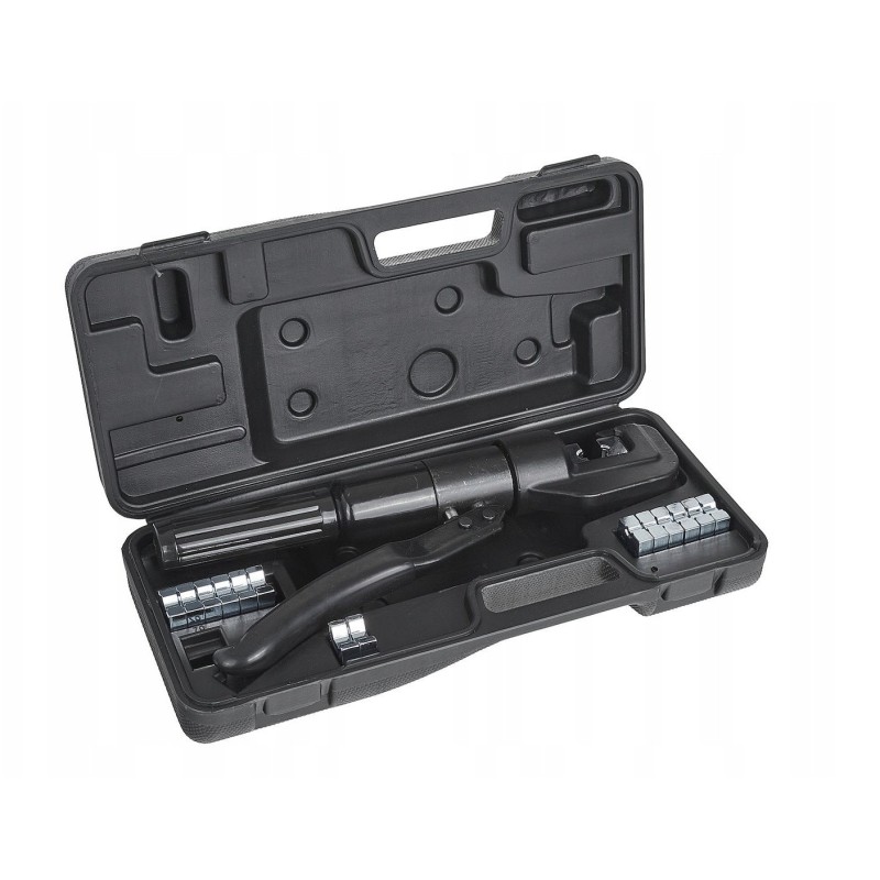 - Skład zestawu: Zaciskarka hydrauliczna, 14 wymiennych matryc zaciskowych, komplet uszczelek O-ring, walizka transportowa