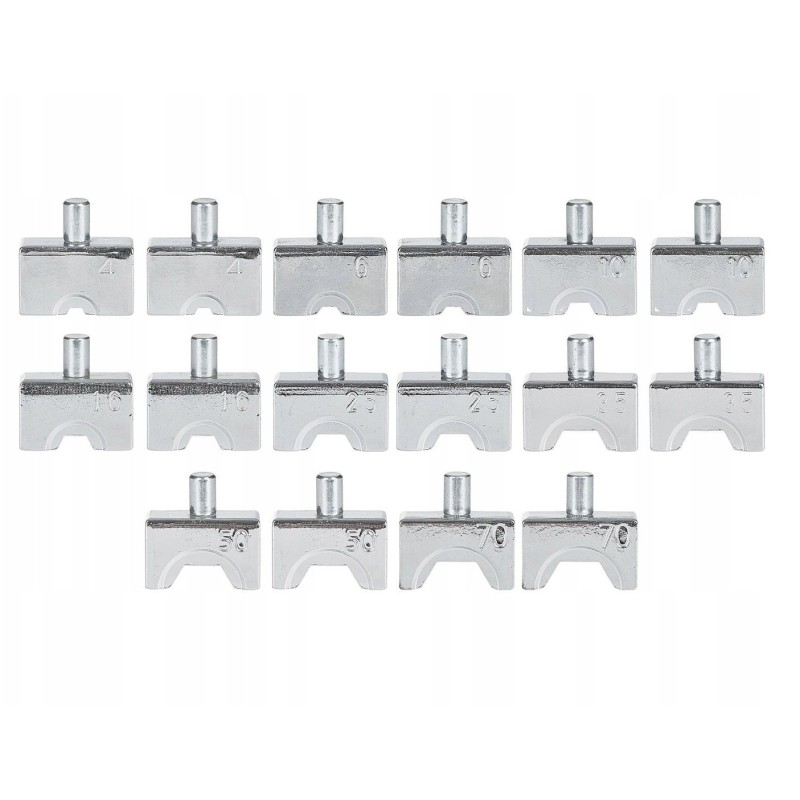 W zestawie znajduje się 14 wymiennych matryc, które umożliwiają precyzyjne dopasowanie do średnicy przewodu. To sprawia, że zaciskarka jest jeszcze bardziej funkcjonalna i dostosowuje się do różnych potrzeb użytkowników.