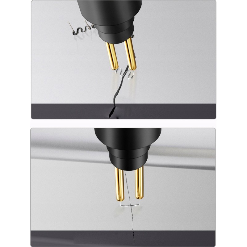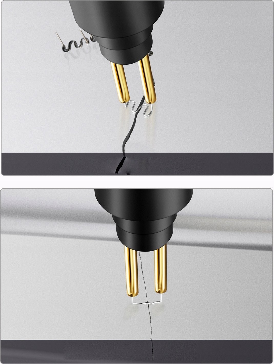 ✅ Dzięki kształtowi grotów możesz wykonać spawanie powierzchniowe, które połączy pęknięcia lub też wykorzystać je jako zszywki. W tym celu zatop grot w poprzek pęknięcia i zdejmij go z widełek spawarki. Po wystygnięciu tworzywa odłam równo wystające końce, aby zszywka była płaska.