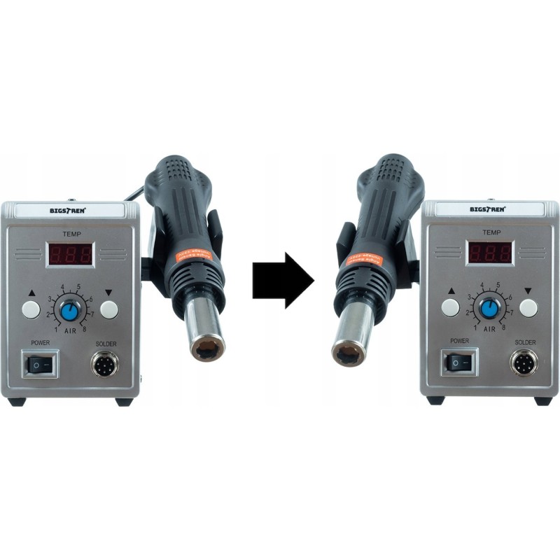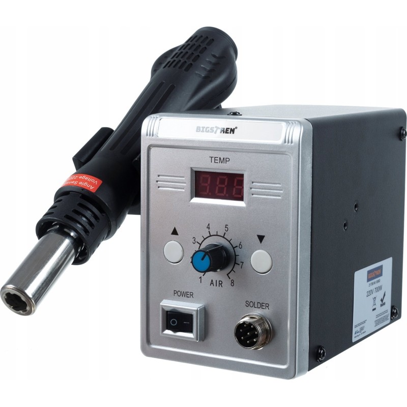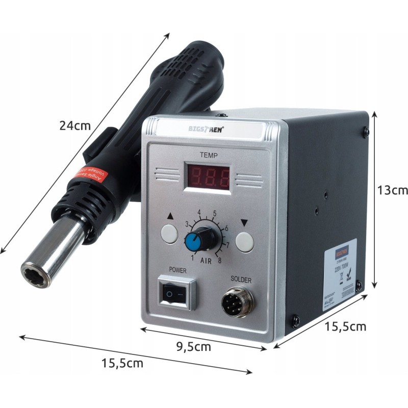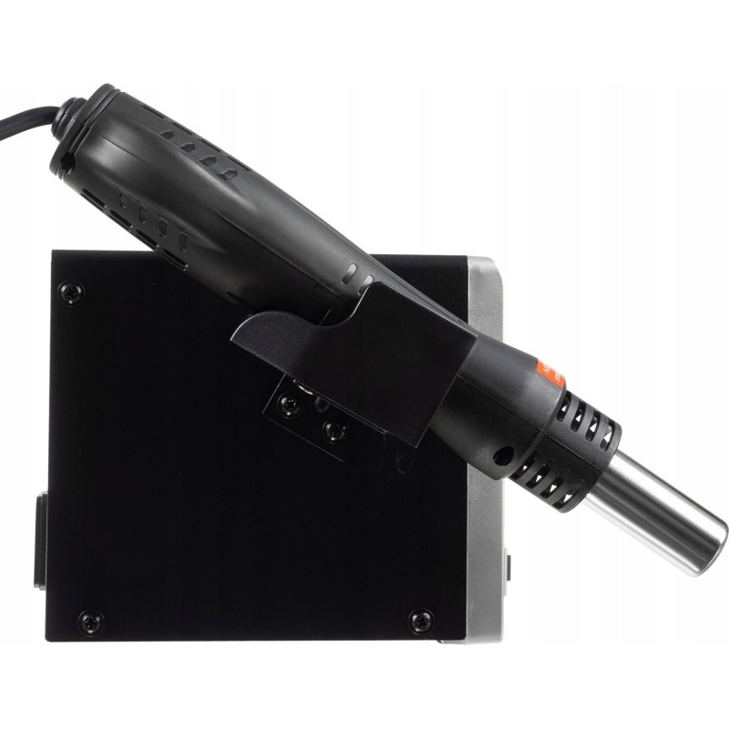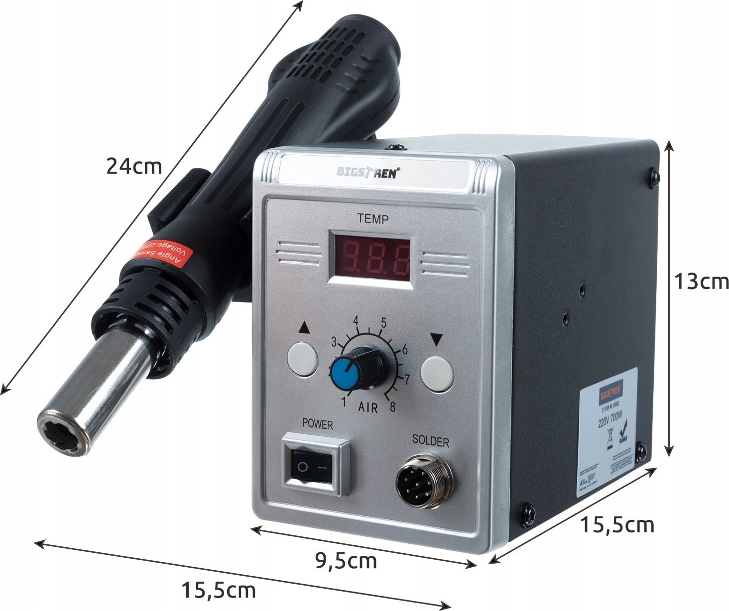 REGULACJA TEMPERATURY I NADMUCHU POWIETRZA Lutownica na gorące powietrze posiada regulację temperatury i nadmuchu powietrza, która umożliwia dostosowanie ilości i mocy ciepła generowanego przez narzędzie. Pozwala to na precyzyjne dopasowanie temperatury do konkretnej aplikacji i materiału. Minimalna temperatura to 100 st a maksymalna 500. ZASTOSOWANIE Urządzanie ma wiele zastosowań w różnych dziedzinach. Są często używane jest lutowania i odlewania plastikowych elementów, zwłaszcza przy naprawie elektroniki. Mogą być również stosowane do usuwania farby, skręcania rur plastikowych, kurczenia termokurczliwych rur, odmrażania zamków, formowania plastiku i wielu innych zadań, które wymagają skoncentrowanego strumienia gorącego powietrza. TRYB CZUWANIA Lutownica posiada tryb czuwania. Po odłożeniu kolby na uchwyt automatycznie zaczyna się chłodzić. Gdy tylko podniesiemy z uchwytu wraca do swojej temperatury. 3 DYSZE W ZESTAWIE W zestawie są 3 okrągłe dysze o średnicy: 4, 7 i 9 mm. Dysze służą do wytwarzania węższego strumienia powietrza więc precyzyjniejszej pracy. 3 DYSZE W zestawie są 3 okrągłe dysze o średnicy: 4, 7 i 9 mm. UCHWYT NA KOLBĘ - MONTAŻ Uchwyt na kolbę montowany jest za pomocą dwóch śrubek. Wystarczy odkręcić śrubki od stacji, dopasować do otworów, które są po dwóch stronach urządzenia, wybrać 1 z nich i przykręcić. SZCZEGÓŁOWE INFORMACJE NA WYŚWIETLACZU Lutownica posiada szczegółowe informacje na wyświetlaczu. KALIBRACJA Włączając urządzenie (0-1) w tym samym czasie trzymaj przycisk zmniejszania temperatury. Rozpocznie się kalibracja. Za pomocą przycisków do kontroli temperatury możesz zmniejszyć lub zwiększyć temperaturę o 100deg;C Do potwierdzenia i zakończenia kalibracji ustaw temperaturę pokazywaną przez miernik, a stacja po chwili wróci do normalnej pracy. REGULACJA TEMPERATURY ORAZ REGULACJA MOCY NADMUCHU Temperaturę ustawia się za pomocą przycisków ze strzałkami góra /dół. Dodatkowo jest pokrętło odpowiedzialne za regulację mocy nadmuchu powietrza od 1 do 8. ANTYPOŚLIZGOWE STOPKI SPECYFIKACJA