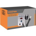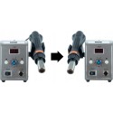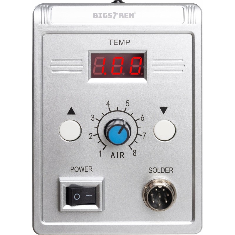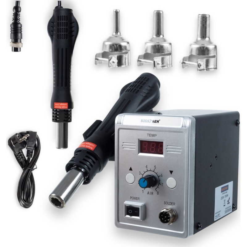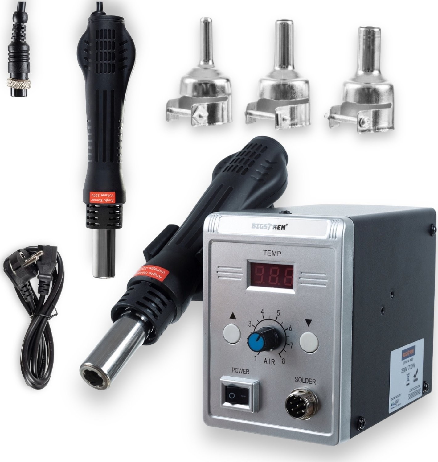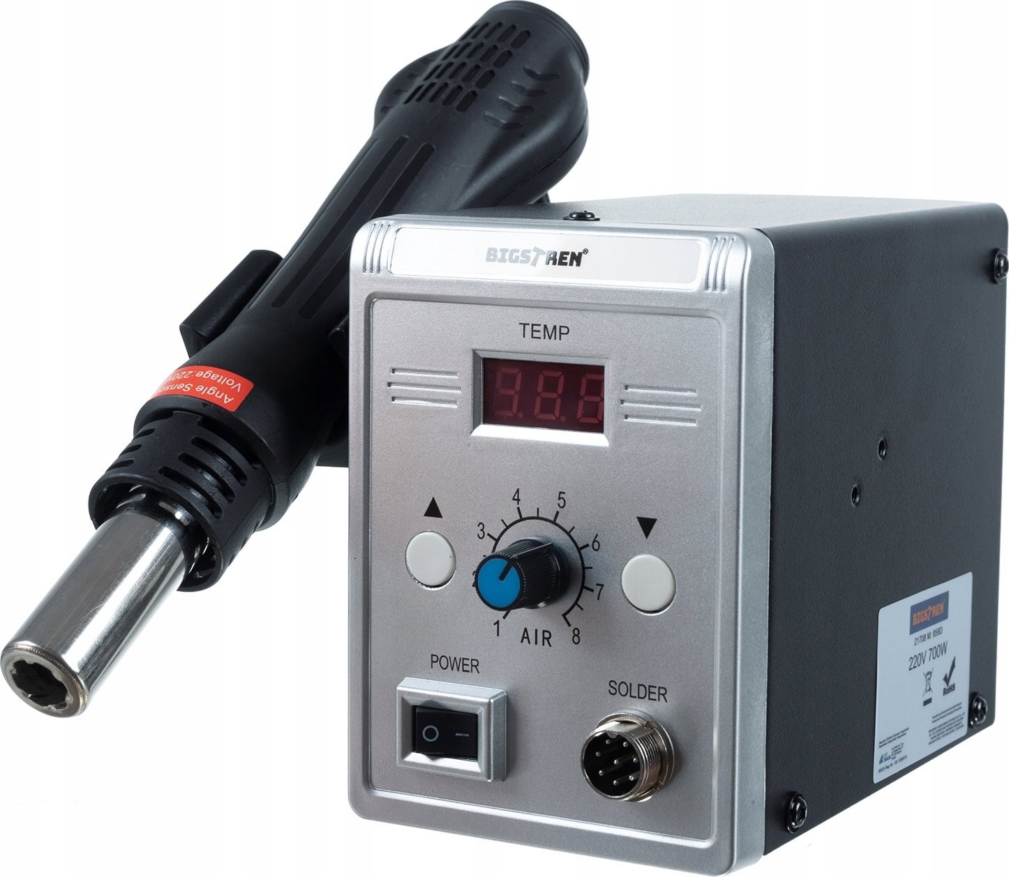 REGULACJA TEMPERATURY I NADMUCHU POWIETRZA Lutownica na gorące powietrze posiada regulację temperatury i nadmuchu powietrza, która umożliwia dostosowanie ilości i mocy ciepła generowanego przez narzędzie. Pozwala to na precyzyjne dopasowanie temperatury do konkretnej aplikacji i materiału. Minimalna temperatura to 100 st a maksymalna 500. ZASTOSOWANIE Urządzanie ma wiele zastosowań w różnych dziedzinach. Są często używane jest lutowania i odlewania plastikowych elementów, zwłaszcza przy naprawie elektroniki. Mogą być również stosowane do usuwania farby, skręcania rur plastikowych, kurczenia termokurczliwych rur, odmrażania zamków, formowania plastiku i wielu innych zadań, które wymagają skoncentrowanego strumienia gorącego powietrza. TRYB CZUWANIA Lutownica posiada tryb czuwania. Po odłożeniu kolby na uchwyt automatycznie zaczyna się chłodzić. Gdy tylko podniesiemy z uchwytu wraca do swojej temperatury. 3 DYSZE W ZESTAWIE W zestawie są 3 okrągłe dysze o średnicy: 4, 7 i 9 mm. Dysze służą do wytwarzania węższego strumienia powietrza więc precyzyjniejszej pracy. 3 DYSZE W zestawie są 3 okrągłe dysze o średnicy: 4, 7 i 9 mm. UCHWYT NA KOLBĘ - MONTAŻ Uchwyt na kolbę montowany jest za pomocą dwóch śrubek. Wystarczy odkręcić śrubki od stacji, dopasować do otworów, które są po dwóch stronach urządzenia, wybrać 1 z nich i przykręcić. SZCZEGÓŁOWE INFORMACJE NA WYŚWIETLACZU Lutownica posiada szczegółowe informacje na wyświetlaczu. KALIBRACJA Włączając urządzenie (0-1) w tym samym czasie trzymaj przycisk zmniejszania temperatury. Rozpocznie się kalibracja. Za pomocą przycisków do kontroli temperatury możesz zmniejszyć lub zwiększyć temperaturę o 100deg;C Do potwierdzenia i zakończenia kalibracji ustaw temperaturę pokazywaną przez miernik, a stacja po chwili wróci do normalnej pracy. REGULACJA TEMPERATURY ORAZ REGULACJA MOCY NADMUCHU Temperaturę ustawia się za pomocą przycisków ze strzałkami góra /dół. Dodatkowo jest pokrętło odpowiedzialne za regulację mocy nadmuchu powietrza od 1 do 8. ANTYPOŚLIZGOWE STOPKI SPECYFIKACJA