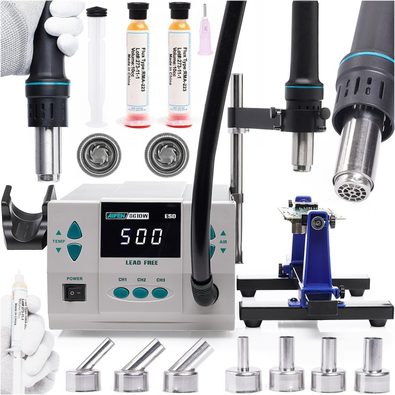 Stacja lutownicza AIFEN 861DW to wszechstronne narzędzie, które z pewnością spełni oczekiwania nawet najbardziej wymagających użytkowników. W zestawie znajdują się różne dysze, uchwyt do gorącego powietrza oraz podstawka montażowa do płytek PCB, co czyni ją idealnym wyborem dla profesjonalistów.