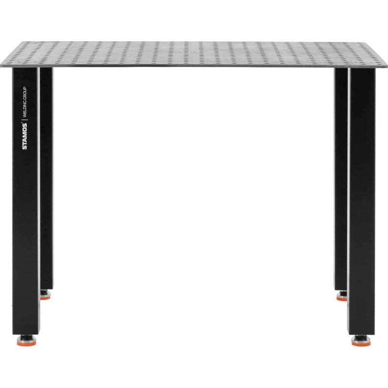 Stół spawalniczy marki STAMOS Germany wykonany z solidnej stali (Q345C/Q235), z blatem roboczym o powierzchni 120 x 80 cm i grubości 10 mm nie chybocze się, ani nie drga nawet podczas spawania z pełną mocą. Perforowana płyta stalowa została osadzona na czterech wyjątkowo mocnych nogach o wymiarach 80 x 80 x 885 mm. Dodatkową stabilność zapewnia możliwość regulacji wysokości nóg nawet o 50 mm i kompensować nierówności podłoża. Otwory w blacie służą do przymocowania i precyzyjnego wyrównania obrabianych przedmiotów. Stabilna konstrukcja utrzymuje przedmioty o łącznej wadze do 150 kg.