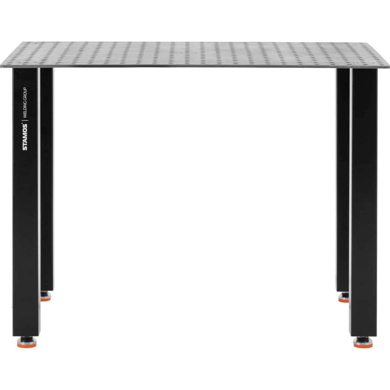 Stół spawalniczy marki STAMOS Germany wykonany z solidnej stali (Q345C/Q235), z blatem roboczym o powierzchni 120 x 80 cm i grubości 6 mm nie chybocze się, ani nie drga nawet podczas spawania z pełną mocą. Perforowana płyta stalowa została osadzona na czterech wyjątkowo mocnych nogach o wymiarach 80 x 80 x 885 mm. Dodatkową stabilność zapewnia możliwość regulacji wysokości nóg nawet o 50 mm i kompensować nierówności podłoża. Otwory w blacie służą do przymocowania i precyzyjnego wyrównania obrabianych przedmiotów. Stabilna konstrukcja utrzymuje przedmioty o łącznej wadze do 100 kg.