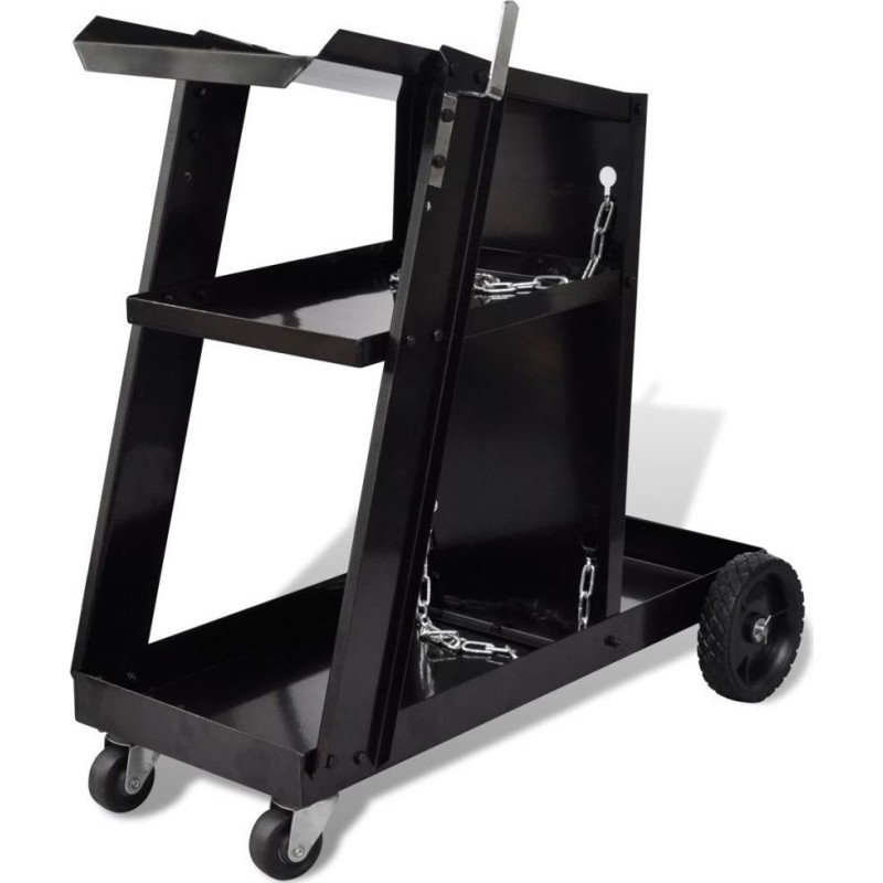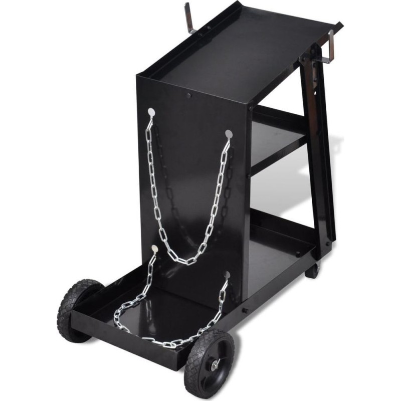 Ten wózek spawalniczy ma solidną stalową konstrukcję. Wyposażony w 3 pomalowane na czarno półki, jest idealnym wyborem do umieszczenia narzędzi warsztatowych, takich jak spawarki MIG, falowniki i akcesoria spawalnicze.