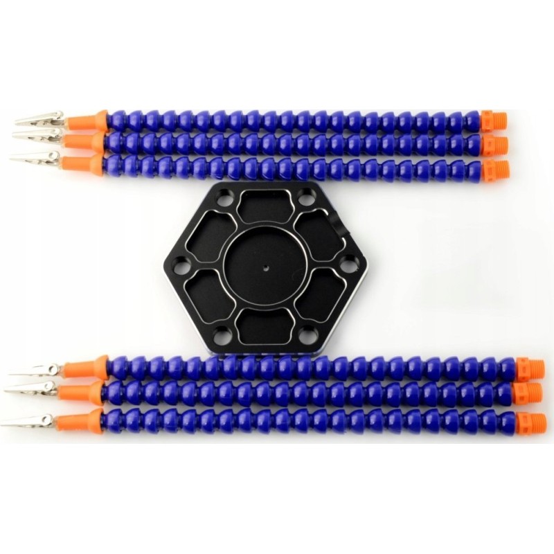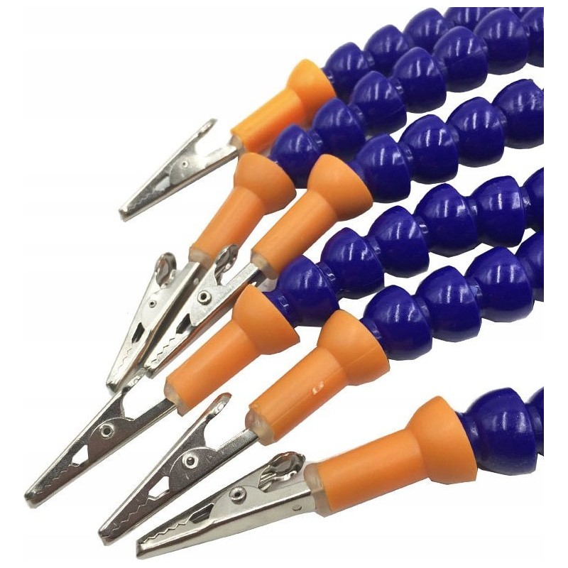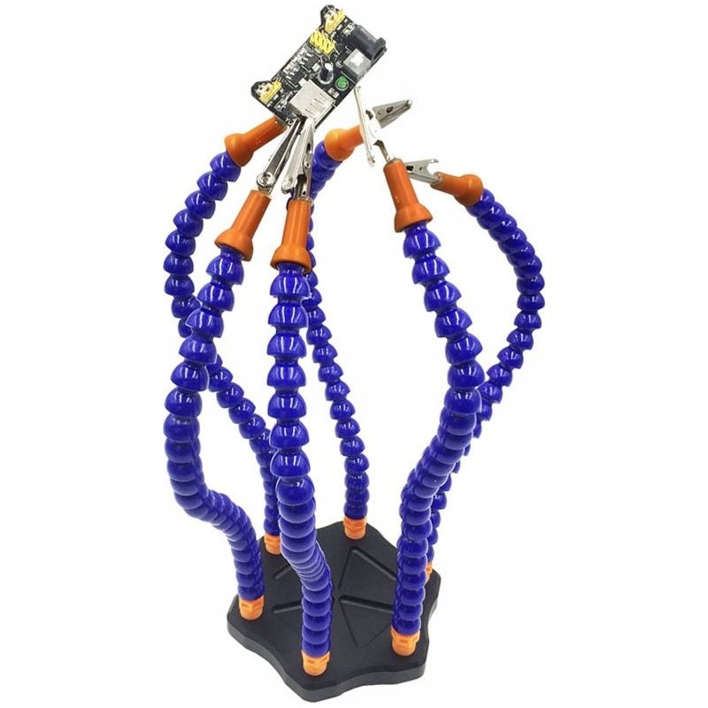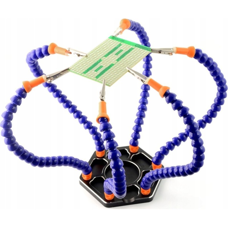 Sześcio- ramienny uchwyt z aluminiową podstawką przeznaczony do prac serwisowych, elektroników, amatorów itp. Dzięki 6 elastycznym ramionom możemy praktycznie złapać dowolny przedmiot, płytę drukowaną nawet o najbardziej zróżnicowanych kształtach. Długość ramion to 32 cm zakończone krokodylkami. Metalowa podstawa ze stopu aluminium zapewnia stabilność. Z powodzeniem może służyć jako zamienni do zestawów trzecia ręka, trzecia rączka itp.