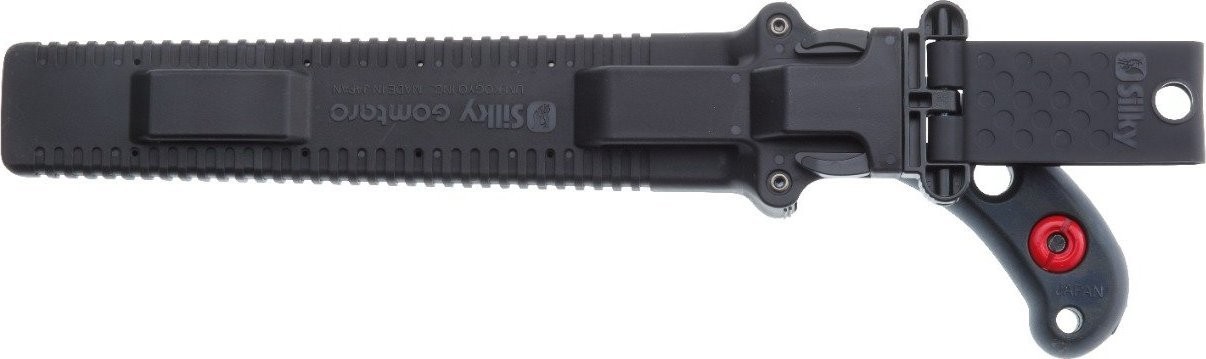 Pochwa piły ręcznej Silky Gomtaro została zaprojektowana w taki sposób, aby utrzymała piłę we wszystkich pozycjach. Nawet, jeśli obrócisz ją do góry nogami - piła nie wysunie się. Zapobiega temu specjalna blokada zamontowana na wejściu do pokrowca. Pochwa wyposażona jest również w dwie rolki, które zapobiegają uszkodzeniom, w trakcie wkładania piły do pokrowca. Dodatkowo w dolnej części obudowy znajduje się mały otwór, który ma za zadanie odprowadzać wilgoć i trociny. Na szczególną uwagę zasługuje również gumowy odlewany uchwyt piły. Wygodnie leży w dłoni, jest idealnie wyważony i pochłania wibracje.