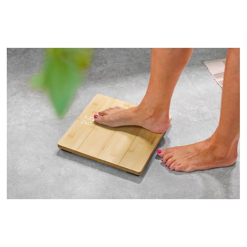 Bambus – stylowy i ekologiczny. Nowoczesna waga łazienkowa Style Sense Bamboo Magic wykonana z prawdziwego bambusa nie tylko ozdobi Twoją łazienkę, ale też zapewni przyjemne uczucie ciepła. Posiada innowacyjny, dużym wyświetlacz LED z białymi świecącymi cyframi, który staje się widoczny dopiero po wejściu na wagę. Pokazuje wagę ciała z dokładnością do 100 g, aż do maksymalnej wartości 180 kg. Duża powierzchnia i płaski design wagi, wraz z antypoślizgowymi stopkami, zapewniają maksymalne bezpieczeństwo i wygodę podczas jej użytkowania. Wyposażona jest również w automatyczne włączanie i wyłączanie. Baterie są wliczone w zestawie.