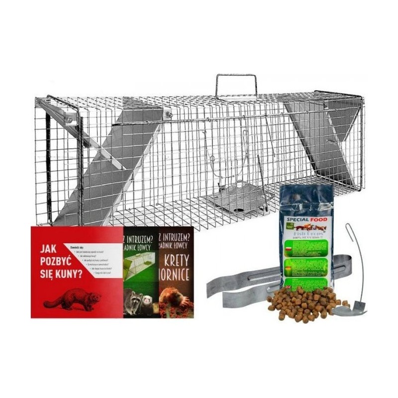 Dane techniczne:Długość: 102cmSzerokość: 20cmWysokość: 27cmWymiar oczka: 23 x 23 mmMateriał: stal ocynkowanaW zestawie:- poradnik łapania zwierząt- zawieszka na wabik- metalowe szczypce- zanęta sypka w formie dropsów o silnym zapachu 150ml- pułapka z wysokiej jakości stali ocynkowanejKlatka na kunę to sprawdzony, a zarazem humanitarny sposób na pozbycie się kun. Żywołapka skutecznie złapie każdą kunę, która następnie możesz wypuścić z dala od swojego domu. Łapka na kunę wykonana jest z ocynkowanej stali, która dzięki zwiększonej odporność na korozję i grubym drutom wytrzymuje więcej i dłużej.Pułapka na kuny jest bardzo prosta w obsłudze i czyszczeniu. Jej mechanizm działania składa się z prostego systemu zapadkowego, który pozwala na natychmiastowe złapanie drapieżnika. Precyzyjne spasowanie elementów zapadni, sprawia że pułapka jest bardzo czuła. Po uruchomieniu przez kunę półki zwalniającej mechanizm natychmiast zatrzaskuje klatkę.Ocynk użyty przy wytwarzaniu łapki pozwala na nie pokrywanie elementów pułapki farbą. Dzięki czemu klatka nie zacina się i nie pozostawia obcego zapachu mogącego spłoszyć zwierzę.Rozmiar pułapki na kunę jest dobrany tak, by zwierzę po złapaniu miało dużo miejsca i bezproblemowy dostęp do powietrza. W celu ułatwienia transportu na górze klatki umieszczono metalową rączkę, która jednocześnie chroni dłonie przed ewentualnym podrapaniem.**...