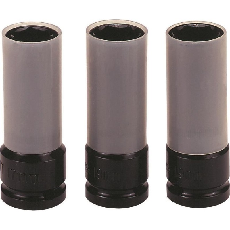 Zestaw 3 1/2" nasadek wykonanych ze stali chromowo-molibdenowej. Do nakrętek kół. Wyposażone w tulejkę chroniącą przed uszkodzeniem aluminiowych obręczy kół.