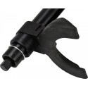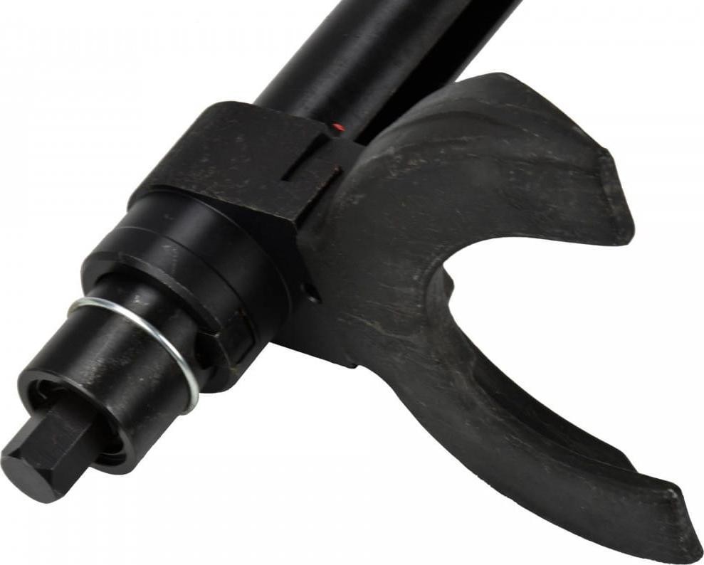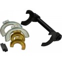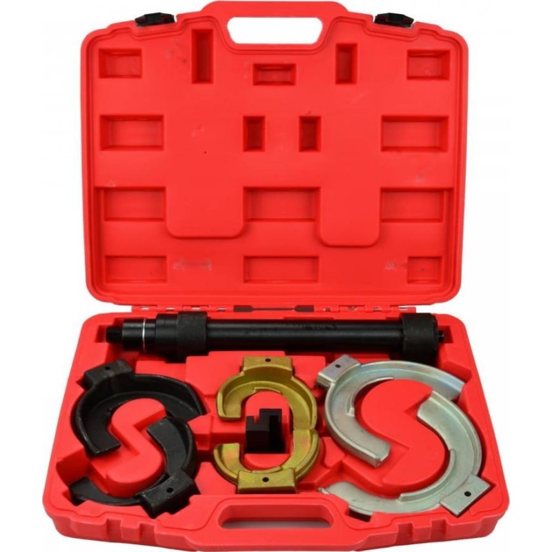 Ściągacz do sprężyn zawieszenia i kolumn typu Mc`Pherson 1500 kg Dane techniczne Typ ściągacza: jednokolumnowy (średnica rury 45 mm) Napęd: śruba 21 mm o drobnozwojnym, trapezowym gwincie Uchwyty: trzypunktowe, regulowane, dostosowane do krzywizny sprężyny Zakres regulacji: 80 - 115 mm, 110 - 150 mm, 140 - 195 mm Maksymalna długość robocza: 305 mm Maksymalna siła nacisku ściągacza: 1500 kg Informacje dodatkowe: dodatkowa nakładka do pracy ze sprężynami stożkowymi