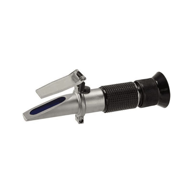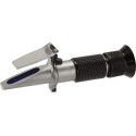 Ręczny refraktometr do łatwej kontroli temperatury zamarzania płynów chłodząco-smarujących i płynów do mycia szyb, również kontroli elektrolitu dla ustalenia stanu akumulatora. Do kontroli zarówno glikolu etylenowego jak i propylenowego. Jest to optyczny przyrząd pomiarowy, przy pomocy którego można bardzo łatwo i szybko zmierzyć stężenie płynu poprzez pomiar jego współczynnika załamania światła. Otworzyć przykrywkę i umieścić na pryzmacie 2-3 krople płynu. Skierować przednią część refraktometru w kierunku źródła światła, wyregulować ostrość przy pomocy okularu i odczytać wartość. Łatwa kalibracja i regulacja.