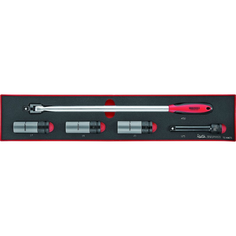 Zestaw 5-elementowy składający się z trzech nasadek 1/2” do śrub mocujących koła - wyposażonych w tuleję ochronną z tworzywa sztucznego, ponadto pokrętła przegubowego 1/2” oraz mocnego przedłużacza 1/2” o długości 125 mm. W pojemniku wstawianym z tworzywa sztucznego. Narzędzia umieszczone są we wkładzie gąbkowym EVA posiadającym trzy warstwy o różnych barwach. Pojemniki pasują do skrzynek i wózków narzędziowych Teng Tools.