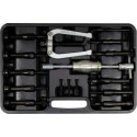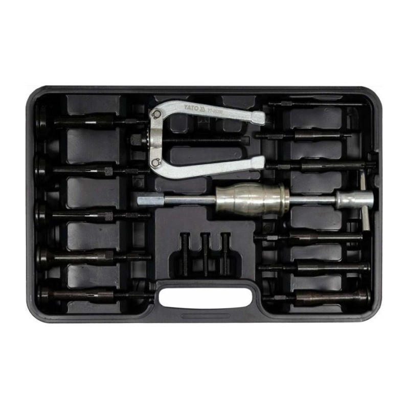 Dane techniczne:Marka: YatoSymbol: YT-25390Seria: GRDMateriał: stal węglowa #45Zastosowanie: do łożysk kulkowych, igiełkowych osadzonych wewnętrznieZakres pracy: 8-58 mmLiczba sztuk w zestawie: 15Zestaw ściągaczy bezwładnościowych do łożysk tulei i bieżni osadzonych wewnętrznie. Przeznaczony jest do pilotujących łożysk kulkowych, igiełkowych, oraz innych elementów wymagających wewnętrznego ściągacza.Zestaw stosowany m.in. do łożysk, które są osadzone na tylnym końcu wału korbowego i podtrzymują wał sprzęgłowy. Zestaw służy do wyciągania łożysk, bieżni zewnętrznych i tulejek o średnicy od 8 - 58 mm.Zawartość zestawu: młotek bezwładnościowy – ściągacz|końcówka do łożysk x10 (8-11 mm, 12-17 mm, 18-23 mm, 24-29 mm, 30-34 mm, 34-38 mm, 39-43 mm, 44-48 mm, 49-53 mm, 54-58 mm)|ściągacz dwuramienny|Zawartość zestawu cd.: redukcja x5 (M10x1.5P, M10x1.5P/ M8x1.25P, M10x1.5P/ M6x1.0P)**Zdjęcie poglądowe....