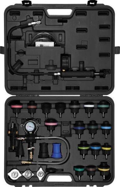 28 elementowy zestaw do testowania przecieków chłodnicy oraz do dokonania szybkiej zmiany płynu chłodniczego.Oznaczone różnymi kolorami nakrętki ułatwiają wybór odpowiedniego korka testowego. Tester przeznaczony jest do serwisów samochodowych, stacji diagnostycznych itp.