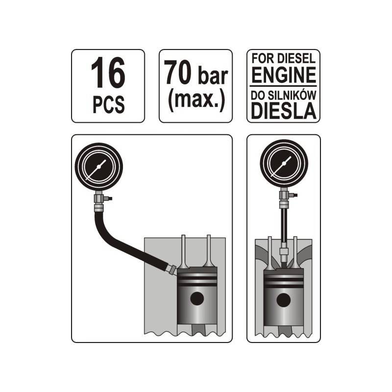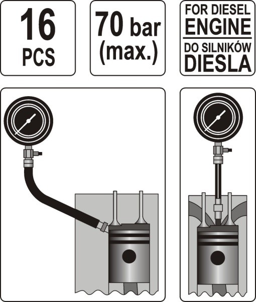 Zastosowanie: do pomiaru i diagnostyki ciśnienia sprężania w silnikach Diesla w samochodach osobowych i dostawczych marek: VW, Audi, Seat, Skoda, Fiat, Alfa Romeo, Lancia, Peugot, Ford, Opel, Toyota, Mercedes, Rover.