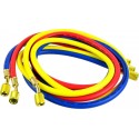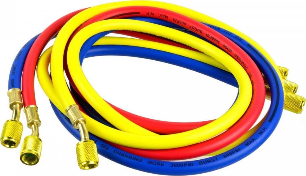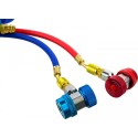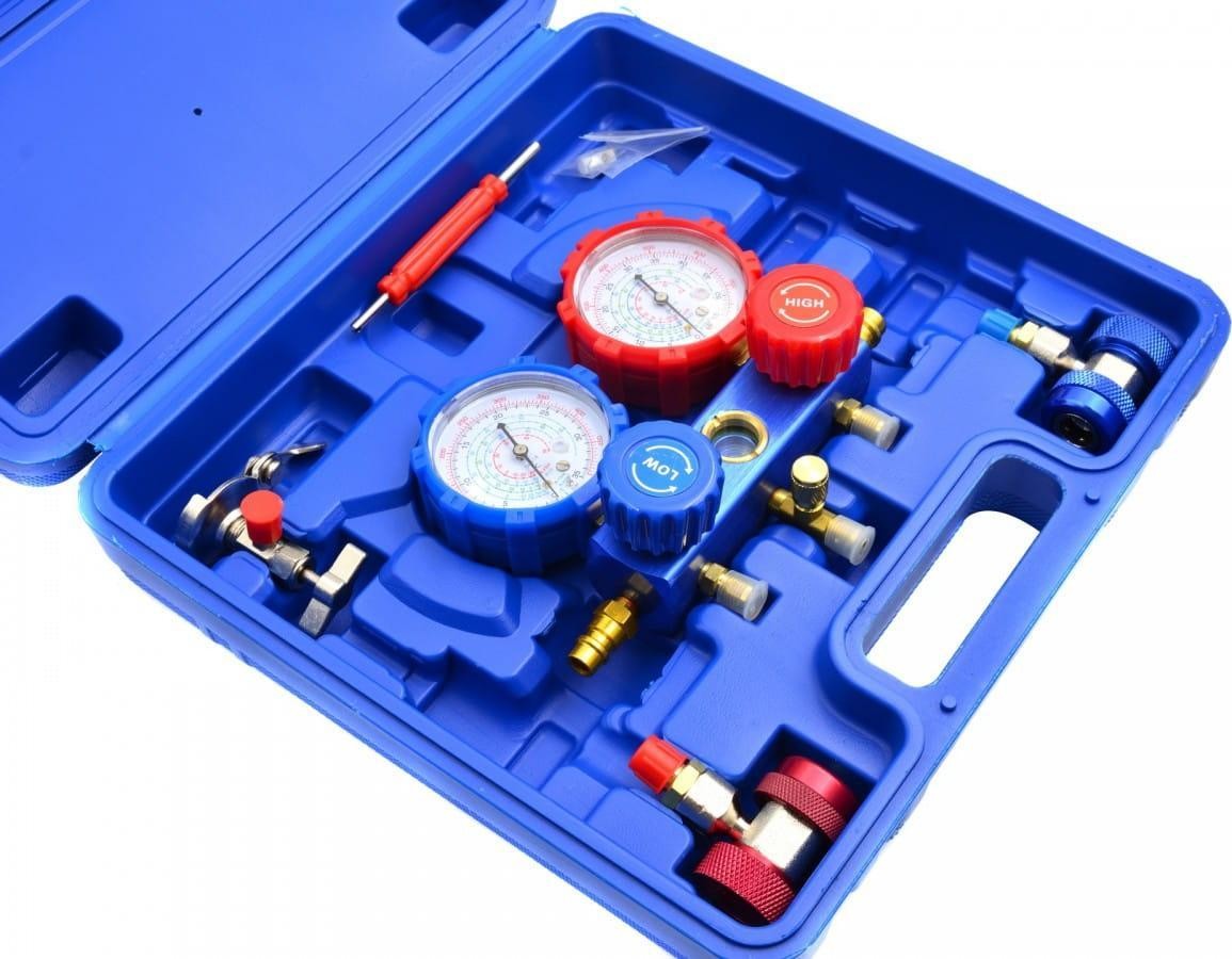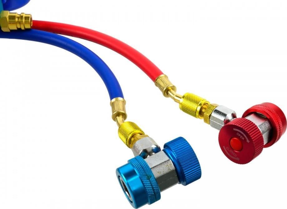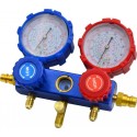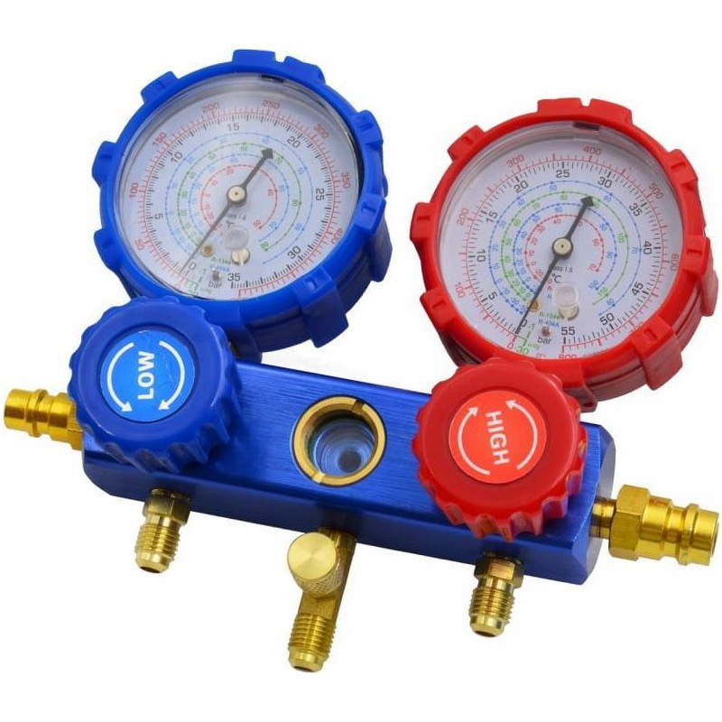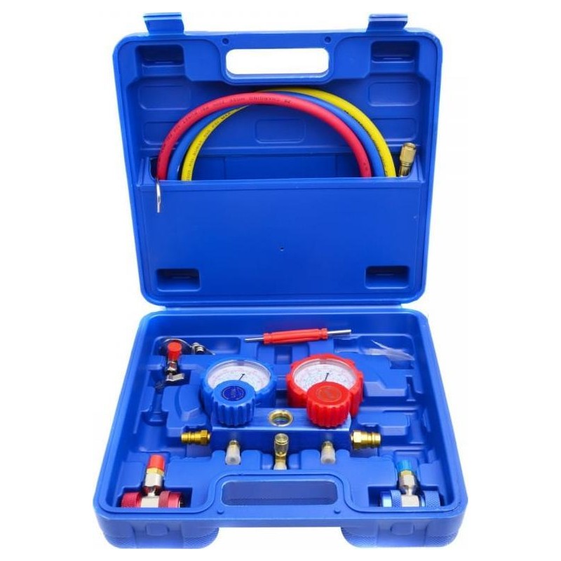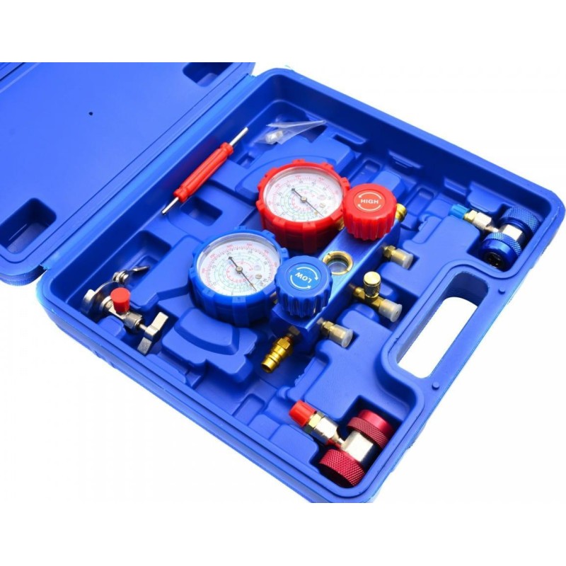 Zestaw do napełniania i opróżniania urządzeń klimatyzacyjnych. Wyposażenie: Blok dwu zegarowy z wziernikiem z szybką Dwa manometry ze skalą na czynniki: R12, R22, R134a, R502 Wkręcany hak do zawieszenia manometrów Trzy różnokolorowe węże 60" Zawór do otwierania butli klimatyzacji Wymienne zawory tłokowe gwarantujące niezawodne uszczelnienie Skala czynników: R12, R22, R134a, R502 Wysokie ciśnienie: 0 - 500 psi (0-35 kg/cm2) Niskie ciśnienie: 0 - 250 psi (0-17,5 kg/cm2) V podciśnienie: 0-30 in/Hg (0-76 cm-Hg) Oba wskaźniki wysokiego i niskiego ciśnienia można skorygować do zera. Skale rozgałęziacza są cechowane w stopniach temperatury i ciśnienia. Wymienne zawory tłokowe zapewniają perfekcyjne uszczelnianie, wypełnione gliceryną-olejem mierniki są wyposażone w zawór zwalniający ciśnienie bezpieczeństwa w przypadku narastania ciśnienia.