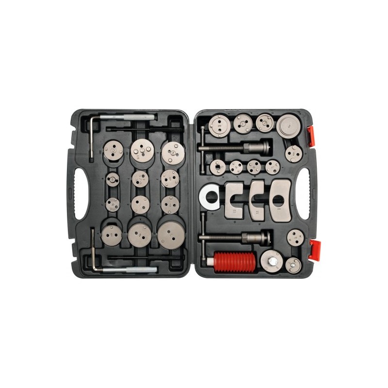 Zestaw przeznaczony do demontażu tłoczków hamulcowych. Przyrząd składa się z dwóch prasek śrubowych prawoskrętnej i lewoskrętnej oraz zestawu talerzyków umożliwiających wymianę tłoczków w szerokiej gamie samochodów.