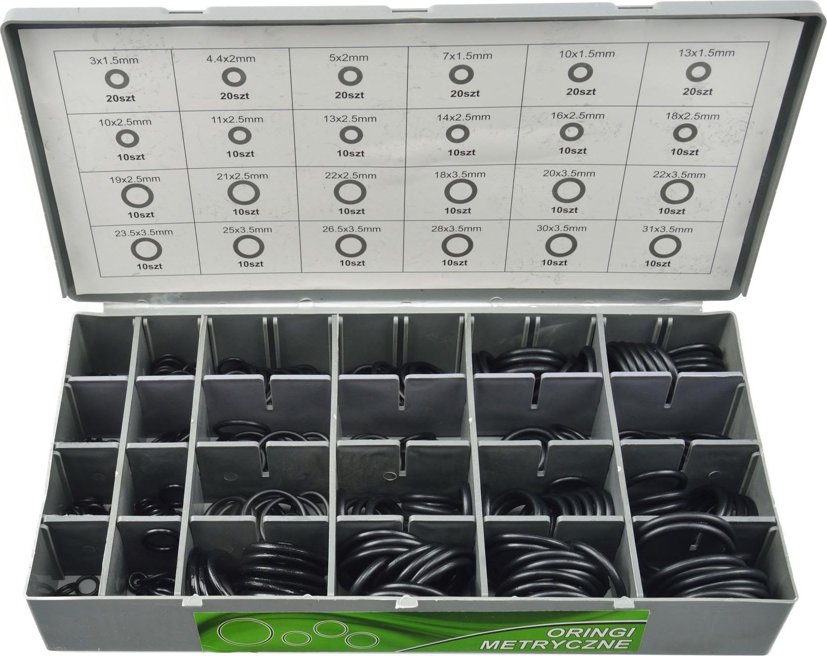 Zestaw oringów HNBR, SAE oraz metrycznczych. O-ringi HNBR Mieszanki na bazie kauczuku nitrylowego uwodornionego. Zakres pracy od -30 do +150°C . Charakteryzują się dużą wytrzymałością mechaniczną oraz zwiększoną odpornością na ścieranie . Odporne na: wodę, oleje i smary silikonowe z dodatkiem ochraniaczy antykorozyjnych paliwa o wysokiej zawartości związków aromatycznych (benzyna, mieszanki alkoholowe) ketonów, estrów, eterów itp. ozon oraz warunki atmosferyczne płyny hydrauliczne typu HFA, HFB oraz HFC rozcieńczone kwasy i zasady w niezbyt wysokich temperaturach O-ringi NBR Mieszanki na bazie kauczuku nitrylowego. Zakres pracy od -30 do +100°C . Charakteryzują się wysoką elastycznością, wytrzymałością na zerwanie, małymi odkształceniami trwałymi przy ściskaniu oraz odpornością na oleje . Odporne na: ciecze hydrauliczne typu HSA i HSB oleje pochodzenia roślinnego i zwierzęcego wodę do 100°C rozcieńczone roztwory kwasów i zasad do +50°C węglowodory alifatyczne (propan,butan) Rozmiary oringów HNBR i ilość sztuk Rozmiary oringów SAE (NBR) i ilość sztuk Rozmiary oringów metrycznych (NBR) i ilość sztuk 5,6 x 1,6 mm - 10 sztuk 3,2 x 1,6 mm - 35 sztuk 3,0 x 1,5 mm - 20 sztuk 6,4 x 1,6 mm - 10 sztuk 4,8 x 1,6 mm - 35 sztuk 4,4 x 2,0 mm - 20 sztuk 6,8 x 1,9 mm - 15 sztuk 9,5 x 1,6 mm - 35 sztuk 5,0 x 2,0 mm - 20 sztuk 7,8 x 1,9 mm - 15 sztuk 9,5 x 2,4 mm - 20 sztuk 7,0 x 1,5 mm - 20 sztuk 8,0 x 1,6 mm - 10 sztuk 12,7 x 1,6 mm - 35 sztuk 10,0 x 1,5 mm - 20 sztuk 8,0 x 2,0 mm - 10 sztuk 12,7 x 2,4 mm - 20 sztuk 10,0 x 2,5 mm - 10 sztuk 8,8 x 1,9 mm - 15 sztuk 15,9 x 2,4 mm - 20 sztuk 11,0 x 2,5 mm - 10 sztuk 11,0 x 1,6 mm - 10 sztuk 17,5 x 2,4 mm - 20 sztuk 13,0 x 1,5 mm - 20 sztuk 11,0 x 2,0 mm - 10 sztuk 19,1 x 2,4 mm - 20 sztuk 13,0 x 2,5 mm - 10 sztuk 11,0 x 2,4 mm - 15 sztuk 19,1 x 3,2 mm - 10 sztuk 14,0 x 2,5 mm - 10 sztuk 12,0 x 2,0 mm - 10 sztuk 20,6 x 2,4 mm - 20 sztuk 16,0 x 2,5 mm - 10 sztuk 13,9 x 1,8 mm - 10 sztuk 20,6 x 3,2 mm - 10 sztuk 18,0 x 2,5 mm - 10 sztuk 14,0 x 2,0 mm - 10 sztuk 22,2 x 2,4 mm - 10 sztuk 18,0 x 3,5 mm - 10 sztuk 14,0 x 2,4 mm - 10 sztuk 22,2 x 3,2 mm - 10 sztuk 19,0 x 2,5 mm - 10 sztuk 15,0 x 2,0 mm - 10 sztuk 23,8 x 3,2 mm - 10 sztuk 20,0 x 3,5 mm - 10 sztuk 17,0 x 2,0 mm - 10 sztuk 25,4 x 3,2 mm - 10 sztuk 21,0 x 2,5 mm - 10 sztuk 17,5 x 1,6 mm - 10 sztuk 27,0 x 3,2 mm - 10 sztuk 22,0 x 2,5 mm - 10 sztuk 17,5 x 3,2 mm - 10 sztuk 28,6 x 3,2 mm - 10 sztuk 22,0 x 3,5 mm - 10 sztuk 30,2 x 3,2 mm - 10 sztuk 23,5 x 3,5 mm - 10 sztuk 31,8 x 3,2 mm - 10 sztuk 25,0 x 3,5 mm - 10 sztuk 33,4 x 3,2 mm - 10 sztuk 26,5 x 3,5 mm - 10 sztuk 35,0 x 3,2 mm - 10 sztuk 28,0 x 3,5 mm - 10 sztuk 36,5 x 3,2 mm - 10 sztuk 30,0 x 3,5 mm - 10 sztuk 38,1 x 3,2 mm - 10 sztuk 31,0 x 3,5 mm - 10 sztuk